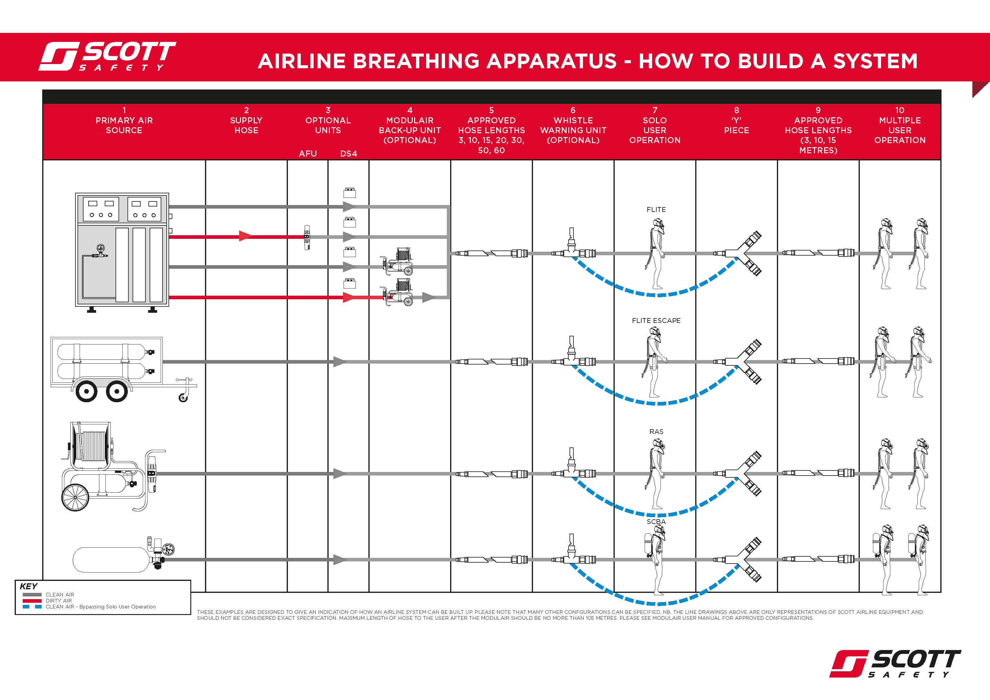 Sistem, genel olarak tam yüz maskesi, bel kemeri, hava tüpü, taşıma arabası, hortum makarası ve antistatik hortumdan oluşmaktadır. Maske ve tüp seçeneklerine aşağıda ki ‘’tamamlayıcı ürünler’’ kısmından erişebilirsiniz.